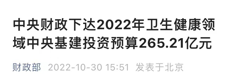 近日,據(jù)財政部官微消息,中央財政下達(dá)2022年衛(wèi)生健康領(lǐng)域中央基建投資預(yù)算265.21億元,推動“十四五”102項重大工程和《“十四五”優(yōu)質(zhì)高效醫(yī)療衛(wèi)生服務(wù)體系建設(shè)實施方案》等任務(wù)落地。