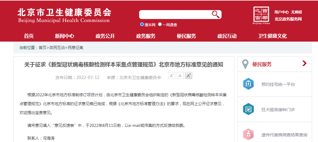 日前,據(jù)北京市市場監(jiān)督管理局網(wǎng)站消息,北京市衛(wèi)生健康委員會組織制定的《新型冠狀病毒核酸檢測樣本采集點管理規(guī)范》,說明了新型冠狀病毒核酸檢測樣本采集點的基本要求、采集點設(shè)置、設(shè)施設(shè)備及物品、人員要求、樣本采集、樣本保存及運(yùn)輸、醫(yī)療廢棄物處理、環(huán)境消殺等多方面做出要求,指導(dǎo)北京的核酸采樣管理。