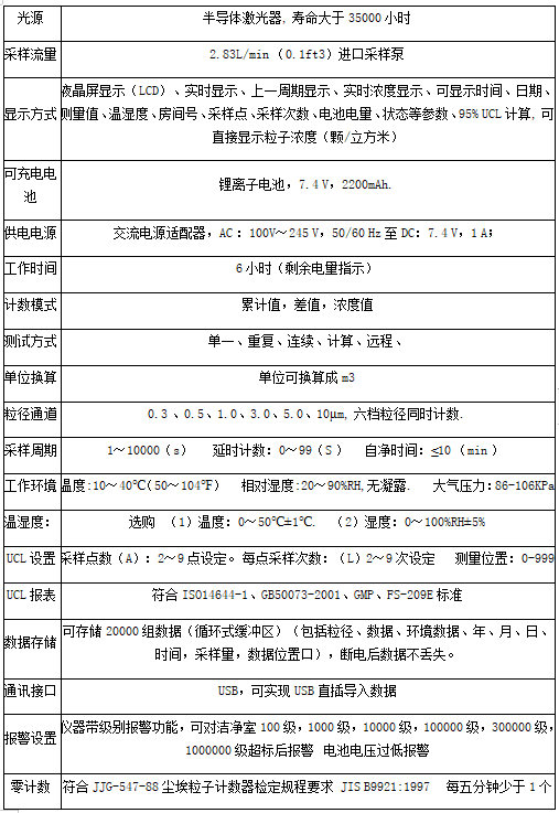 3、該粒子計數器按照國際通用標準設計(空氣采樣流量為28.3升/分),能同時對設定的六個粒徑通道進行檢測